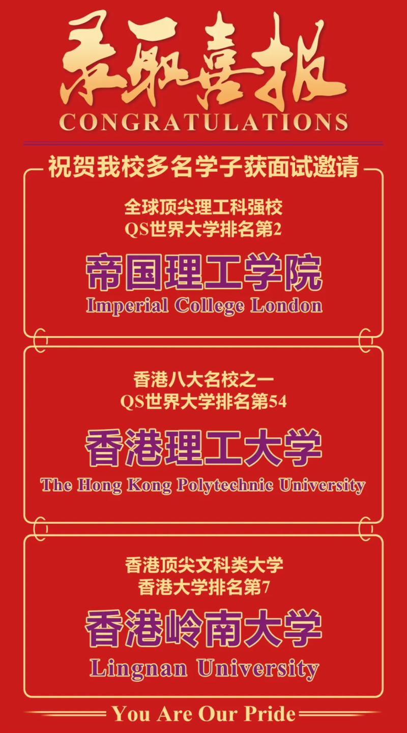 祝贺本校多名学生收获三大学校——英国帝国理工学院、香港理工大学以及香港岭南大学的面试邀请!