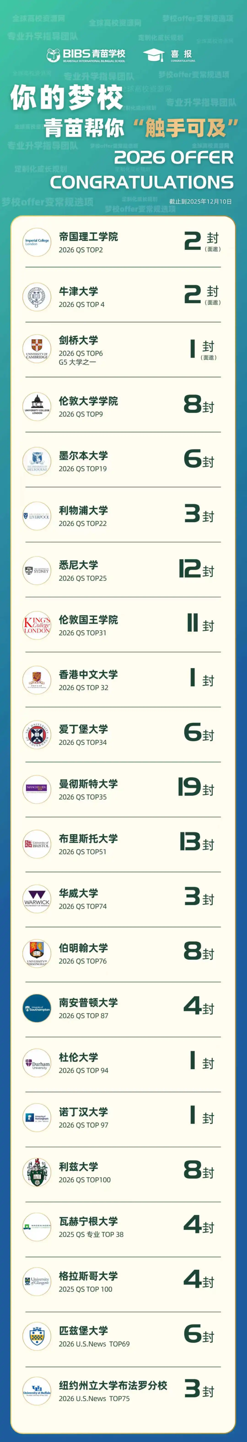 伦敦大学学院、香港中文大学、墨尔本大学、悉尼大学、爱丁堡大学、伦敦国王学院、曼彻斯特大学等世界学府,已向青苗学子发放上百封录取通知书!