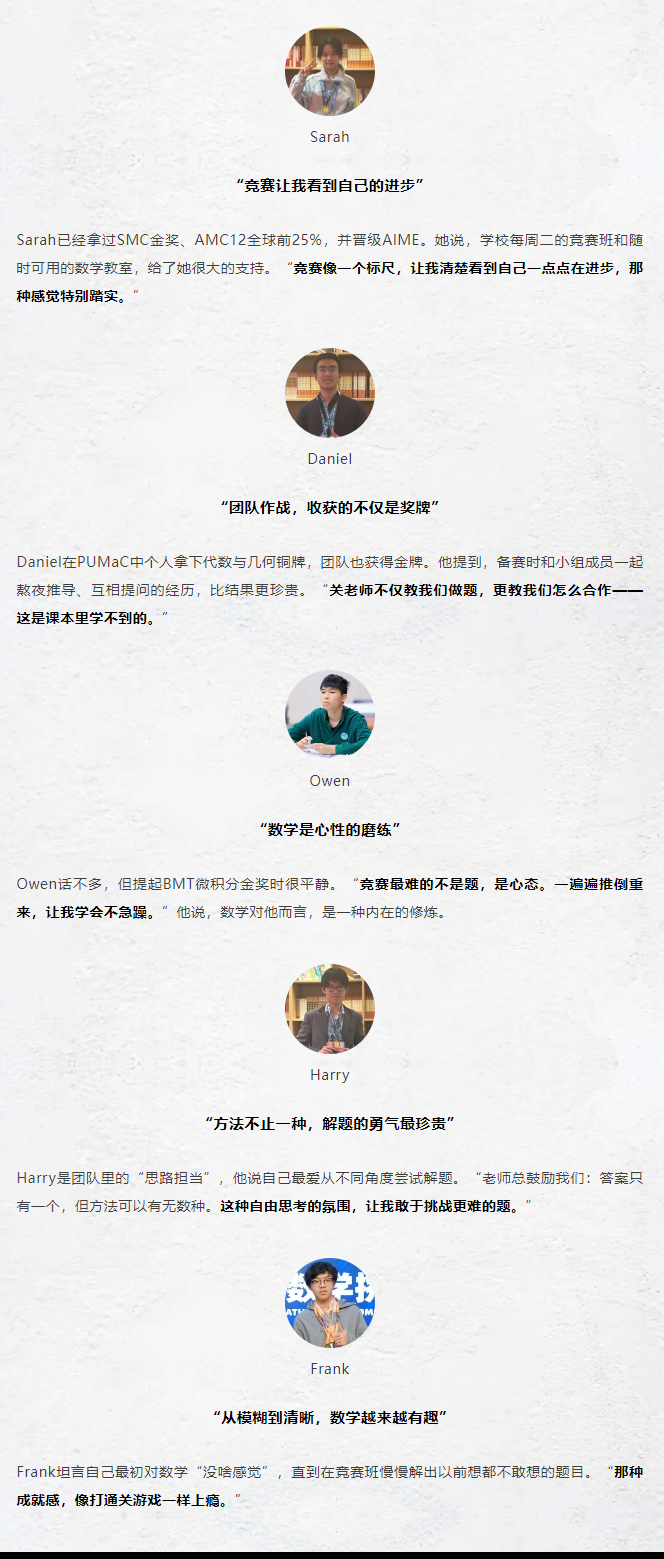 就像这次数学竞赛班再次于普林斯顿大学数学挑战赛中拿下多项奖项一样——力量轮金牌、团队轮金牌、总分铜牌,所有这些都不是偶然爆发的结果,而是日复一日的思维训练、团队协作与师生共进的自然呈现。