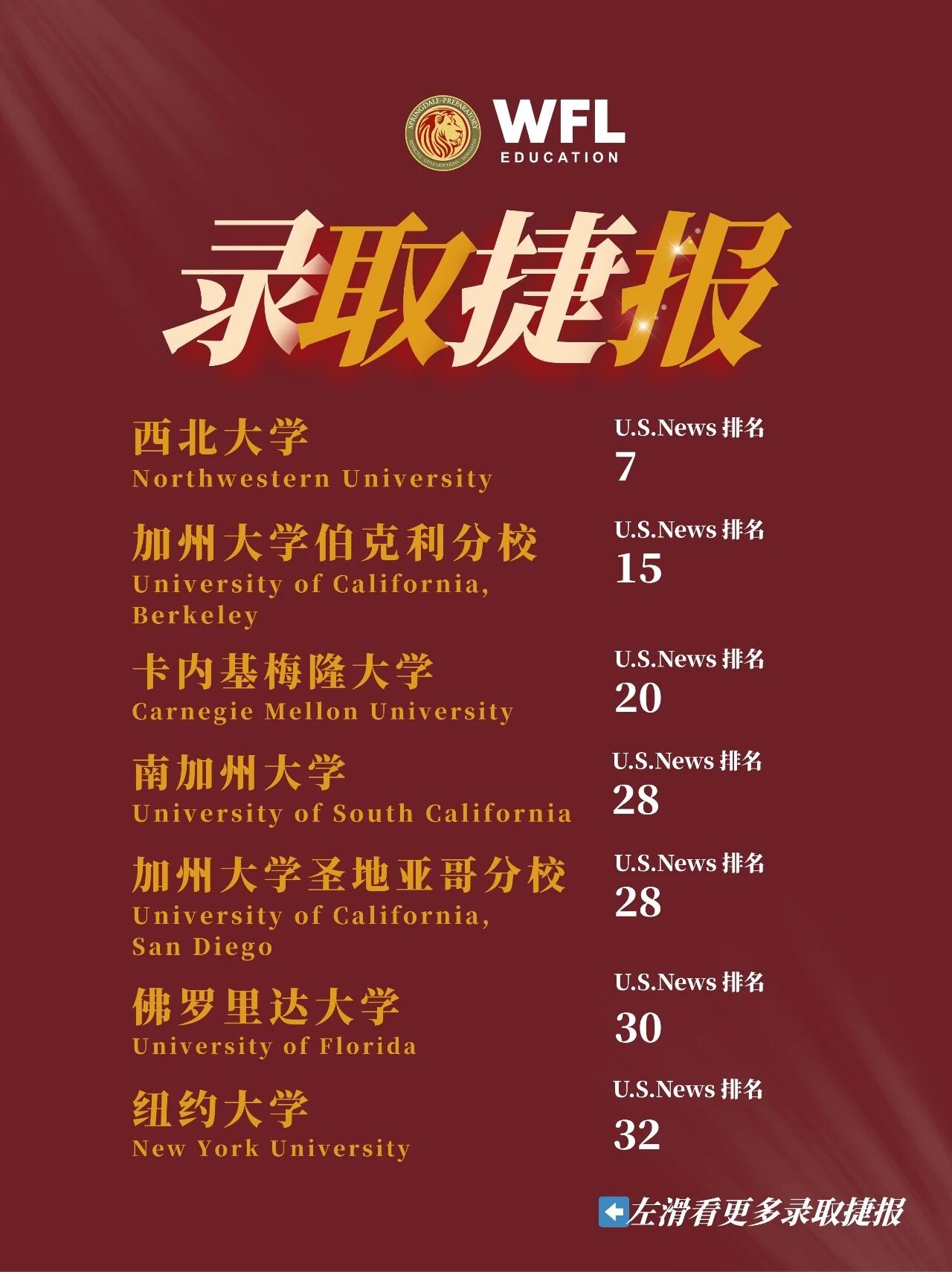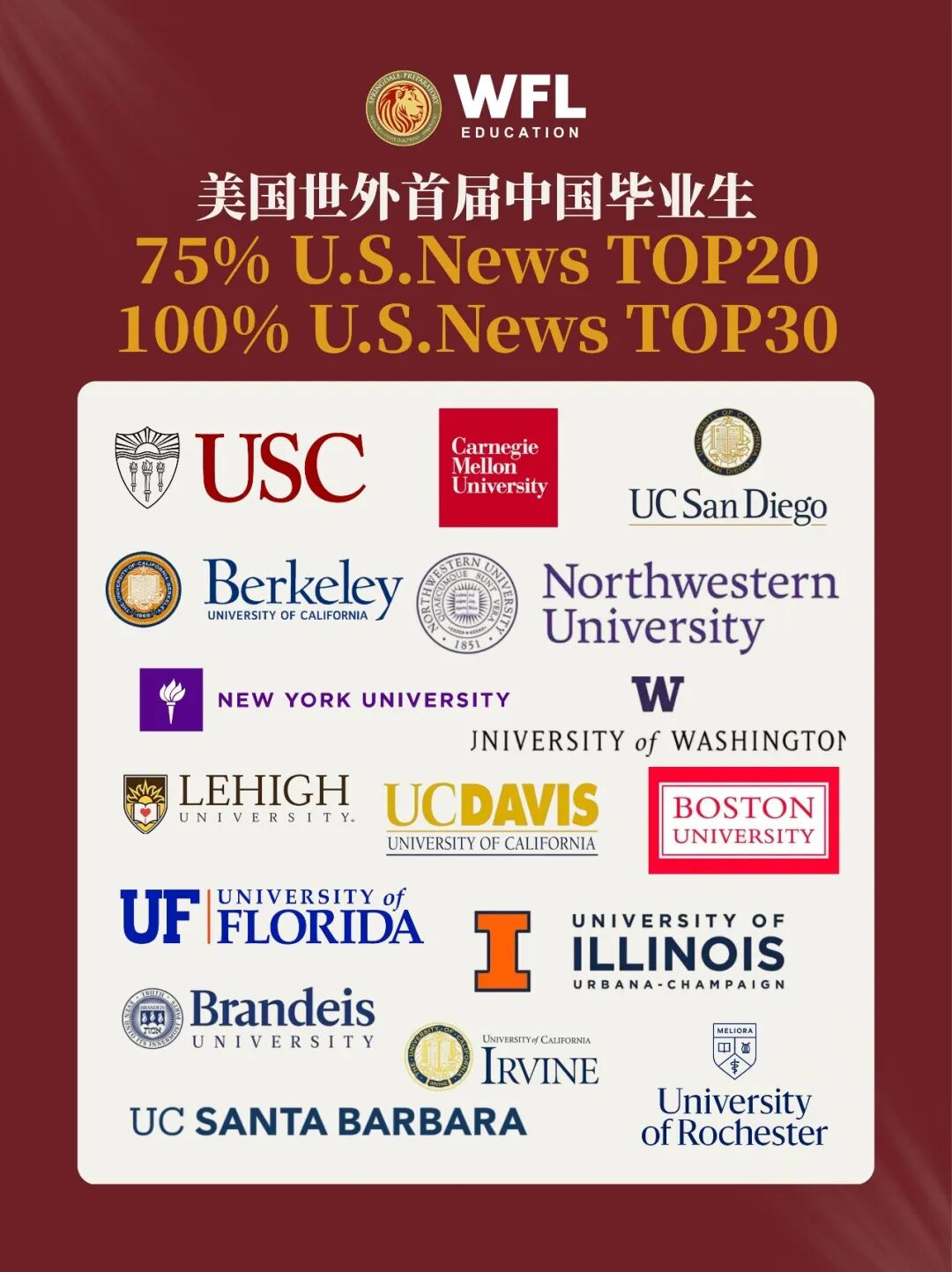 在此次申请季中,美国世外首届中国毕业生表现惊艳。截至26年3月31日,录取院校覆盖范围广泛,包括全美TOP7的西北大学(传播学专业录取)、前15的加州大学伯克利分校(全美公立第一)、TOP20的卡内基梅隆大学(艺术×科技交叉强校)、文科与影视领域的南加州大学、具有无界校园和全球视野的纽约大学、工科殿堂伊利诺伊大学香槟分校UIUC,几乎囊括了UC系学校,如UC圣地亚哥、UC戴维斯、UC欧文、UC圣塔芭芭拉。更值得关注的是录取数据的含金量,U.S.NewsTOP20录取率达75%,U.S.NewsTOP30录取率为100%。