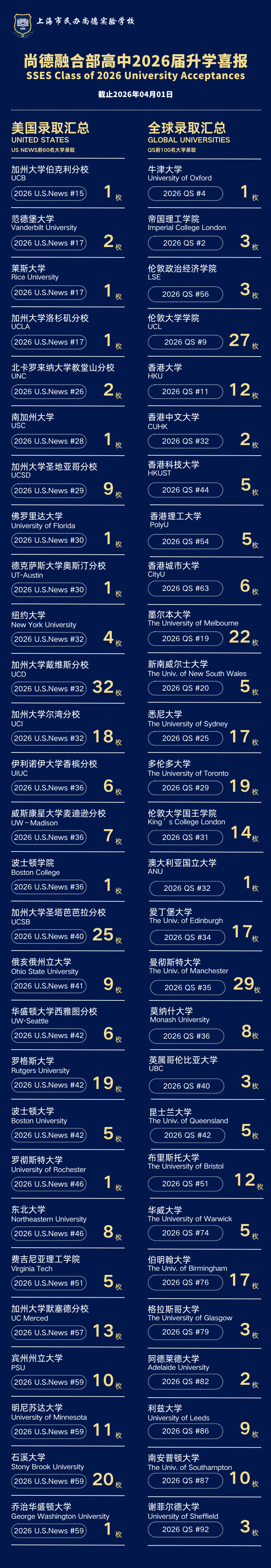截至2026年3月28日,尚德融合部高中毕业生已全部收获来自美国、英国、加拿大、中国香港、澳大利亚等国家和地区的世界学府录取通知书。除范德堡大学、莱斯大学、卡尔顿学院等重磅offer外,还囊括加州大学伯克利分校、加州大学洛杉矶分校、南加州大学、纽约大学、帝国理工学院、伦敦政治经济学院、伦敦大学学院、多伦多大学等全球院校,升学版图进一步拓展。