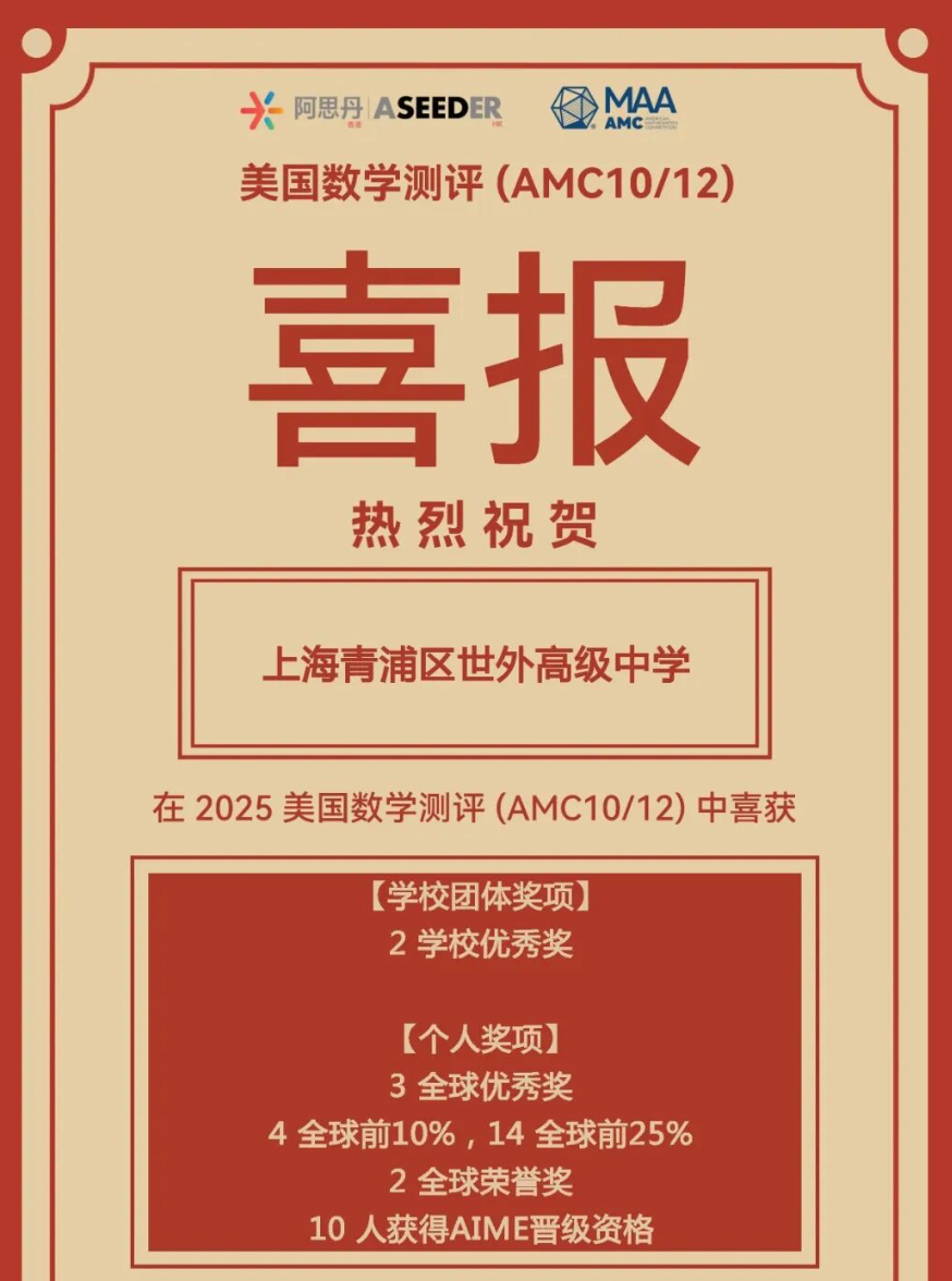 2025年11月6日与14日,阿思丹香港(ASEEDER)举办的“2025年美国数学测评(AMC10/12)”在线上及考点学校同时举行。上海青浦区世外高级中学在此次竞赛中成绩斐然,获得2个学校优秀奖、3个全球优秀奖、4个全球前10%、14个全球前25%、2个全球荣誉奖,共有10名学生获得AIME晋级资格。