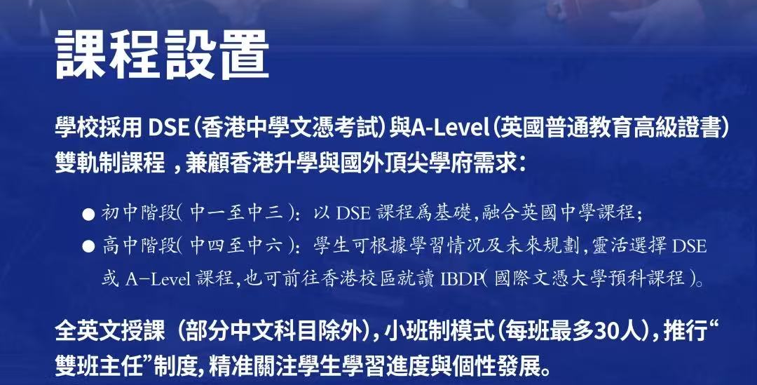 高中(中四至中六) :可自由选DSE/A-Level,也可以去香港校区读IBDP(国际文凭课程)!全英文授课(部分中文科目除外),小班制(每班≤30人),双班主任全程盯进度,学习进度慢?不存在的!