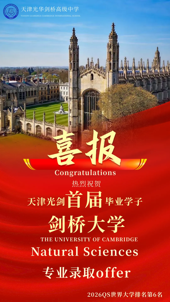 重磅喜讯,天津光剑首届学子凭借优异的学术成绩、突出的综合素养及扎实的科研潜力,成功通过剑桥大学严格的选拔流程,斩获该校预录取offer。