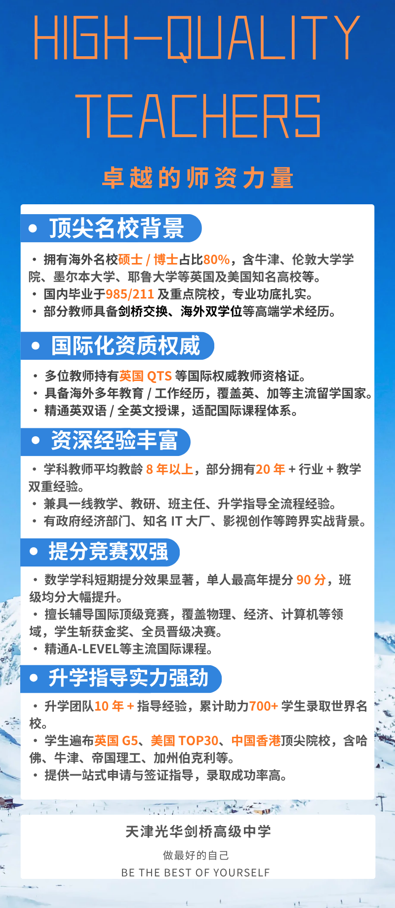 天津光华剑桥高级中学的国际高中师资具备高学历、国际化、经验丰富且成果显著的特点。优秀的教师团队是学生成长和发展的重要保障。