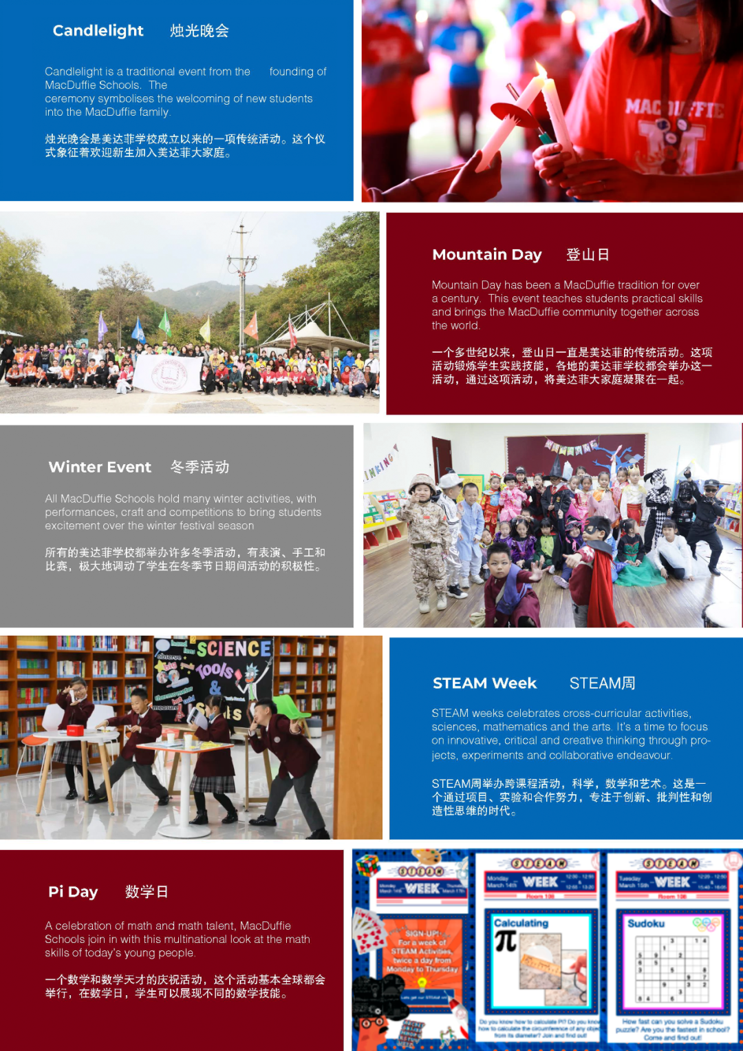 天津美达菲学校传承百年传统活动,每年举办,这些活动团结了各大洲的美达菲学校,象征着学校的价值观、荣誉准则和对学生领导力培养的重视。学校继去年“助残义卖”后,今年再次募集60余万元善款,用于南开区对口帮扶的甘肃省脱贫地区教育公益项目。此外,登山日、玉兰日等数十项活动也是学校传统活动的重要组成部分。