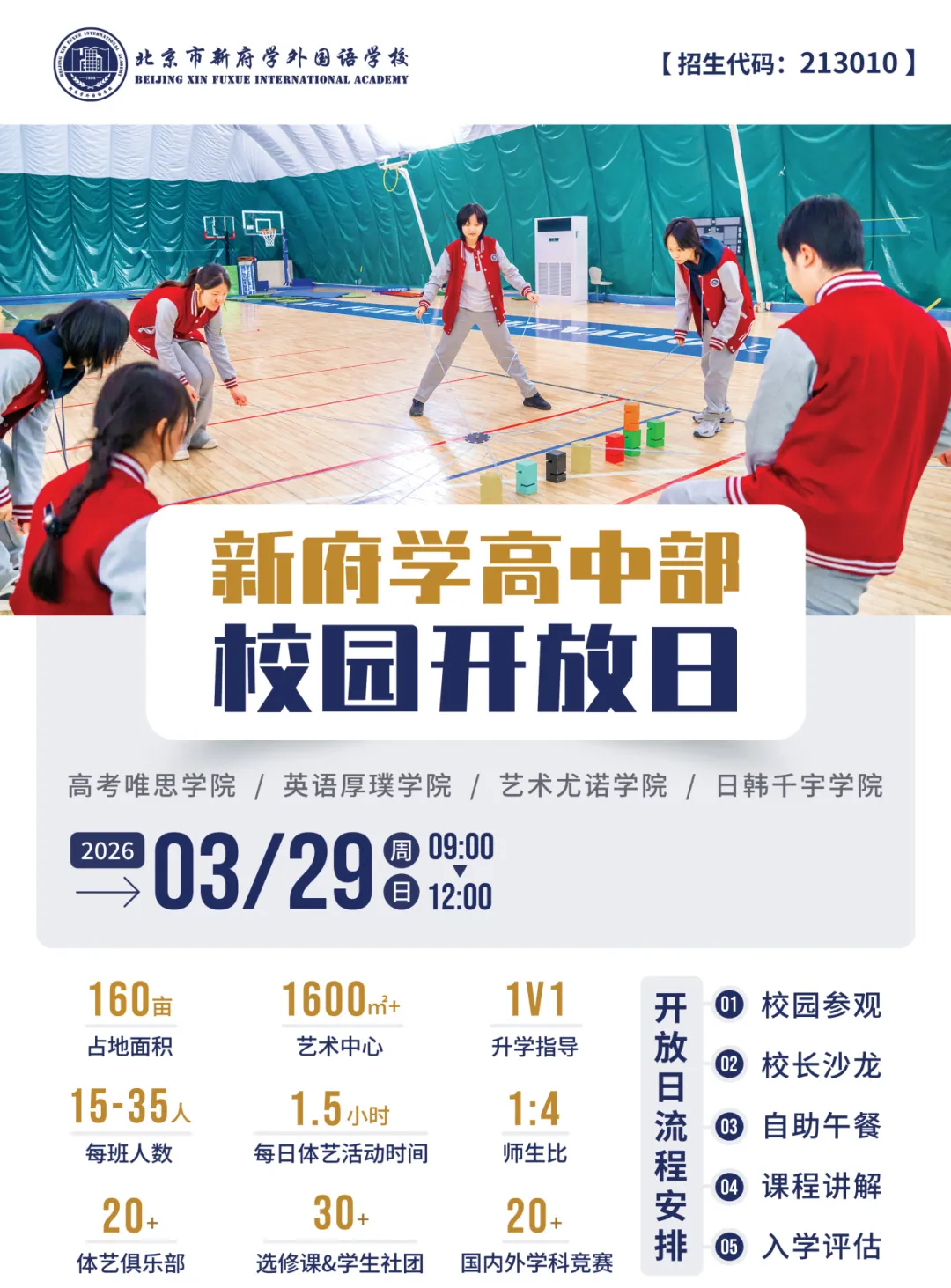 为助力家长深入了解学校,缓解择校焦虑,新府学高中部将于3月29日(周日)举办本学期首场校园综合开放活动,活动内容丰富,涵盖校园参观、课程咨询、校长面对面交流、入学评估、升学规划指导以及自助午餐等环节。