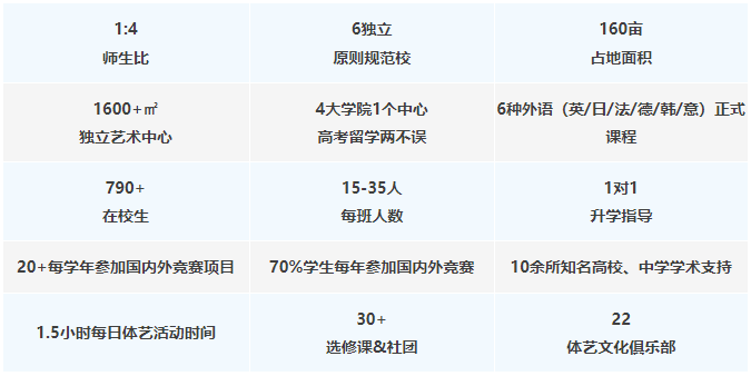 学校拥有高水平教师支持天团,包括高考九大学科特级教师、北大清华十大领域教授、三大语言高校日语德语意大利语老师、各类运动项目国家 级教练团、艺术导师、多所高校客座教授以及各领域职业精英导师。