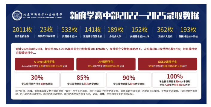 2022-2025届毕业生凭借卓越的学术实力,累计斩获全球牛校录取offer高达2011份!其中不仅包含英国G5学府23份,更有588份世界Top 30学校offer与971份世界Top 50学校offer。整体录取成绩斐然:85%的学生成功跻身世界Top 30学校,更有30%的学生叩开了世界Top 10学府的大门。