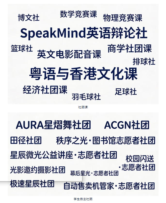 此外,学校开设十余种学科类与艺体类社团课程和学生自主社团,丰富学习选择,发挥学生主动性与创造力。
