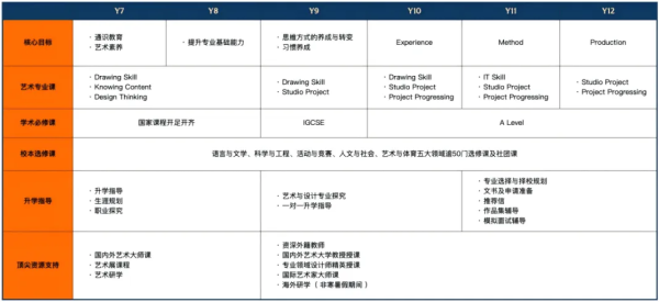 校内提供“一站式”升学服务,专业升学指导团队为每个学生量身定制升学规划,明确不同学段应达成的目标,并采用QSTop 10艺术类高校定制化混申策略,全力护航牛校申请。服务内容包括:学术与专业学科课程、专业课程、作品集辅导与制作;语言与背景(语言学习、背景提升、竞赛、夏校);指导与申请(大师课、国内外研学、升学指导、面试辅导、文书写作指导);成长导师制(配备国际艺术方向海归教师作为全职班主任,全程指导学习与海外生活准备);个性化支持(1v1升学指导,联动海外院校招生官开展个性化指导)。