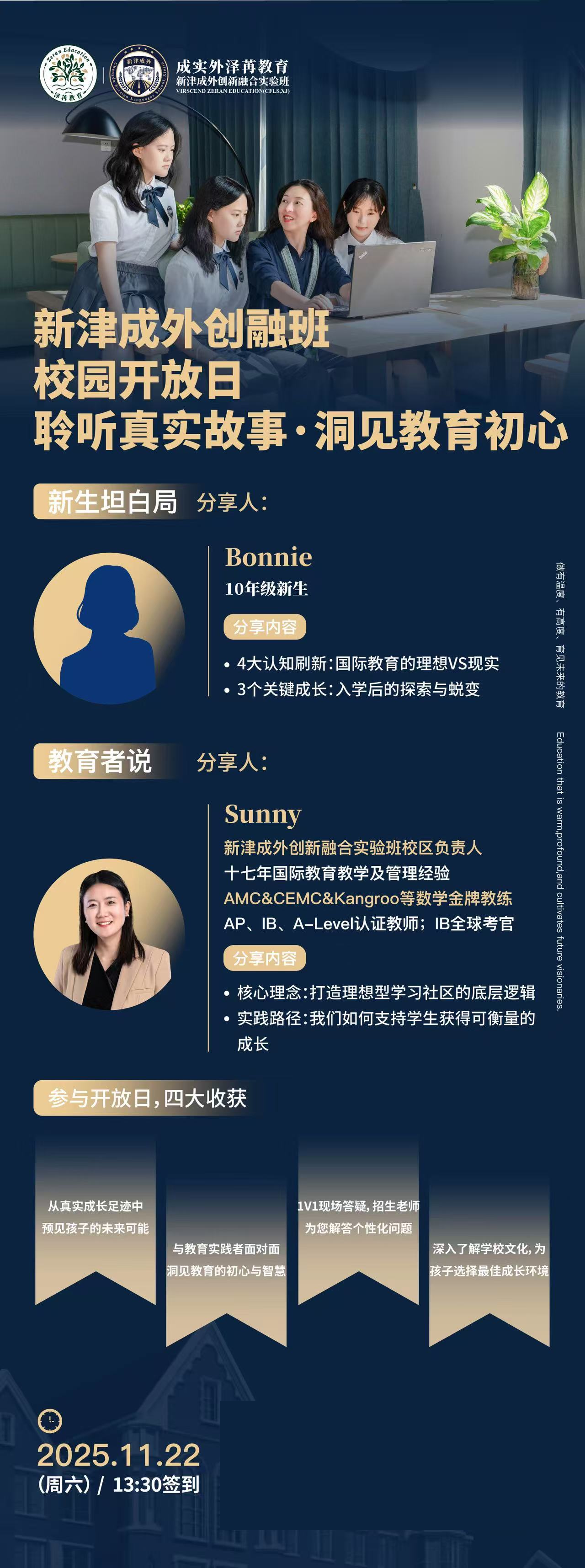 新津成外创新融合实验班实施中国普通高中课程与美国高中必修课程,AP课程相融合的课程体系,是美国百年学校胡沙克学校在西南地区合作项目,学生入读即注册美高学籍。该项目依托于成实外教育集团的资源平台,立足于成都市新津区成外学校自主办学开设,以培养根植于中国文化、学识广博、具有创新思辨,探究精神和突出特长的国际化杰出人才为己任。