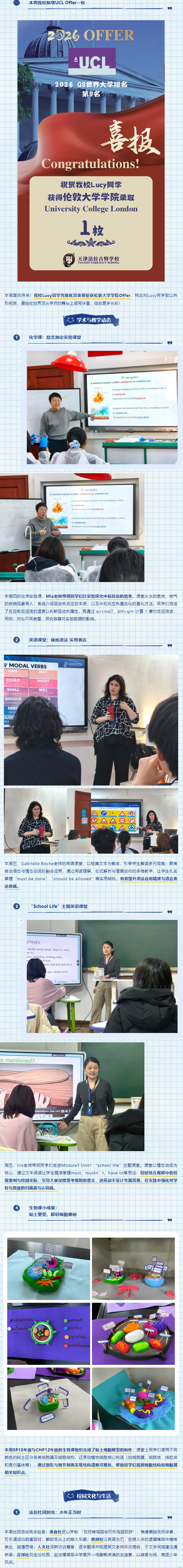 本周的法拉古特校园,学术探索与成长喜悦交织生辉:Lucy同学凭借优异表现斩获伦敦大学学院 Offer,为校园荣誉添彩;课堂之上,化学实验的科学探究、英语文本的多元解读、主题教学的场景赋能与生物模型的创意制作,让知识在实践中生根;社团活动亮点纷呈,为校园生活注入鲜活活力。这份兼具深度与温度的校园日常,正书写着成长的精彩篇章,让我们一同走进本周Newsletter,重温每一份收获与感动!