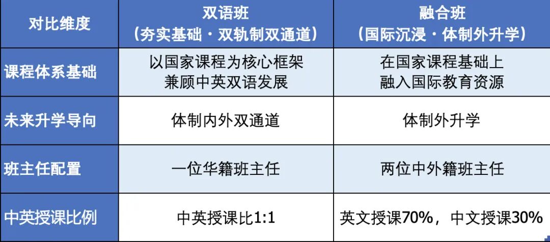 课程设置与升学导向:融合班课程深度贴合国际化升学需求,以体制外升学为核心导向,英语授课比例近 70%,全力营造沉浸式纯英文学习环境,助力孩子夯实国际语言能力与跨文化学习思维,为接轨国际教育体系做好准备。而双语班课程则以夯实国家课程内容为主,兼顾国际化教育理念,支持孩子未来体制内、体制外双向升学选择。在教学中,更注重夯实义务教育阶段语文、数学、英语等基础学科的知识储备,同时培养双语应用能力。